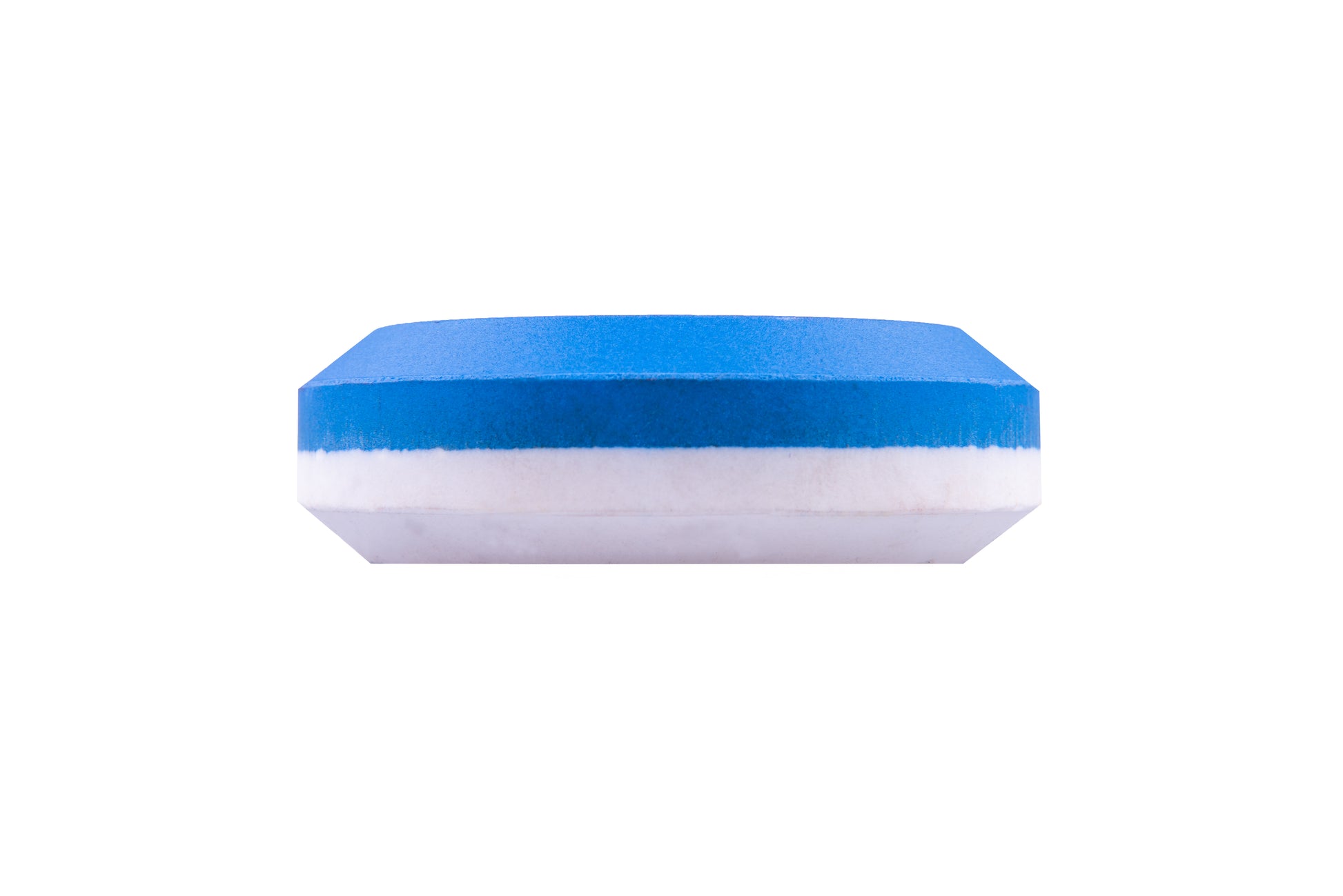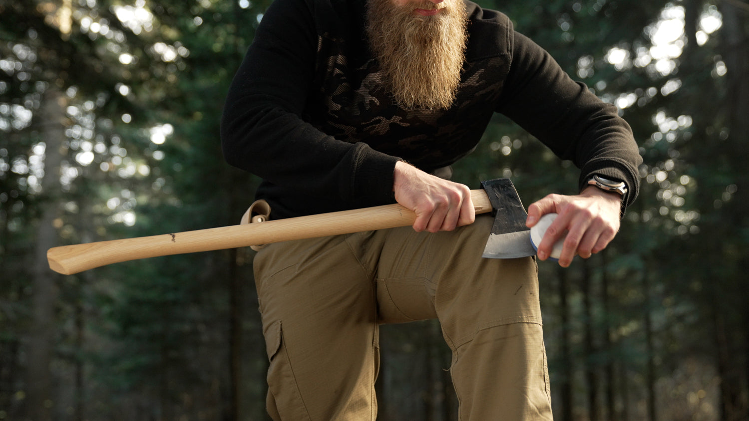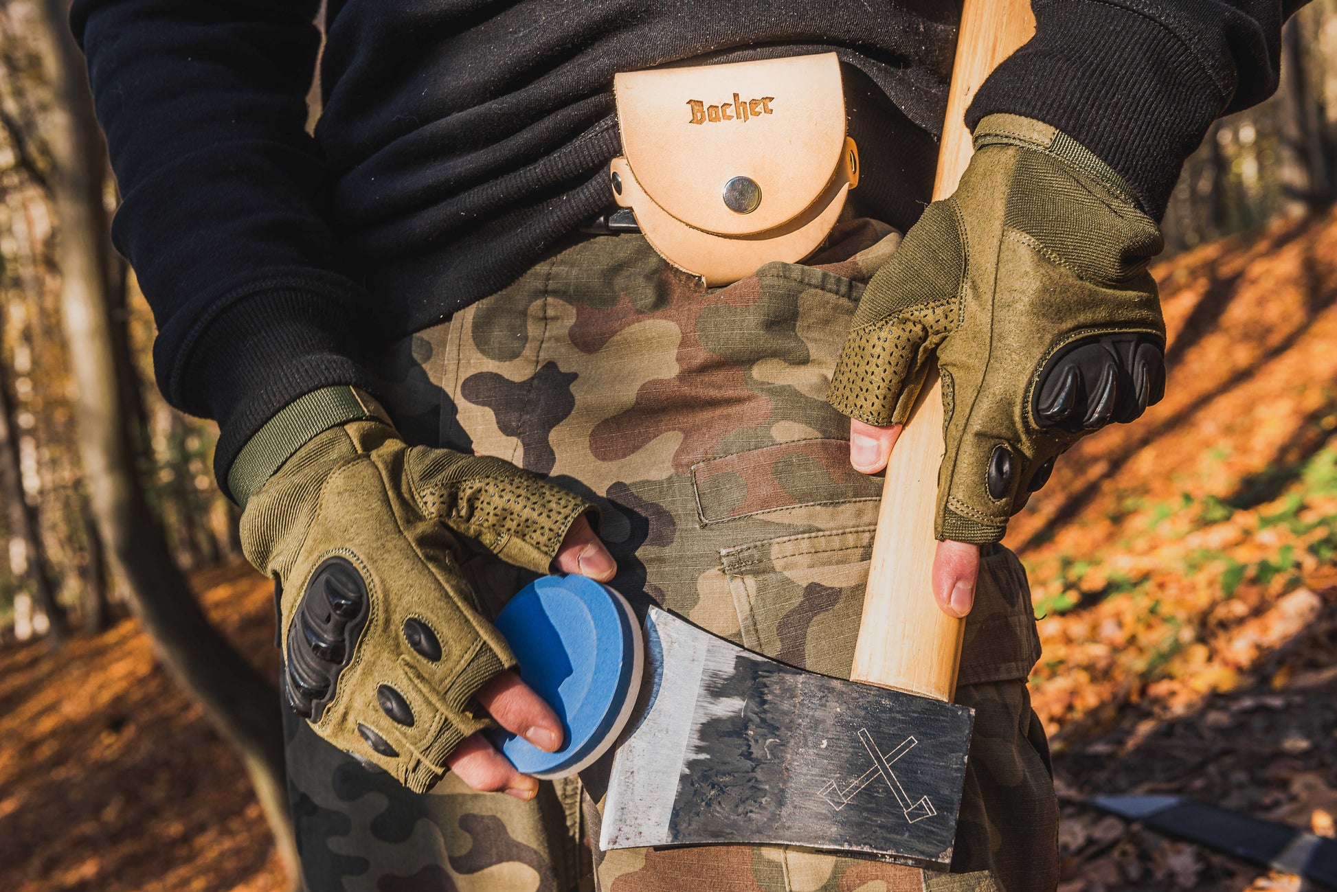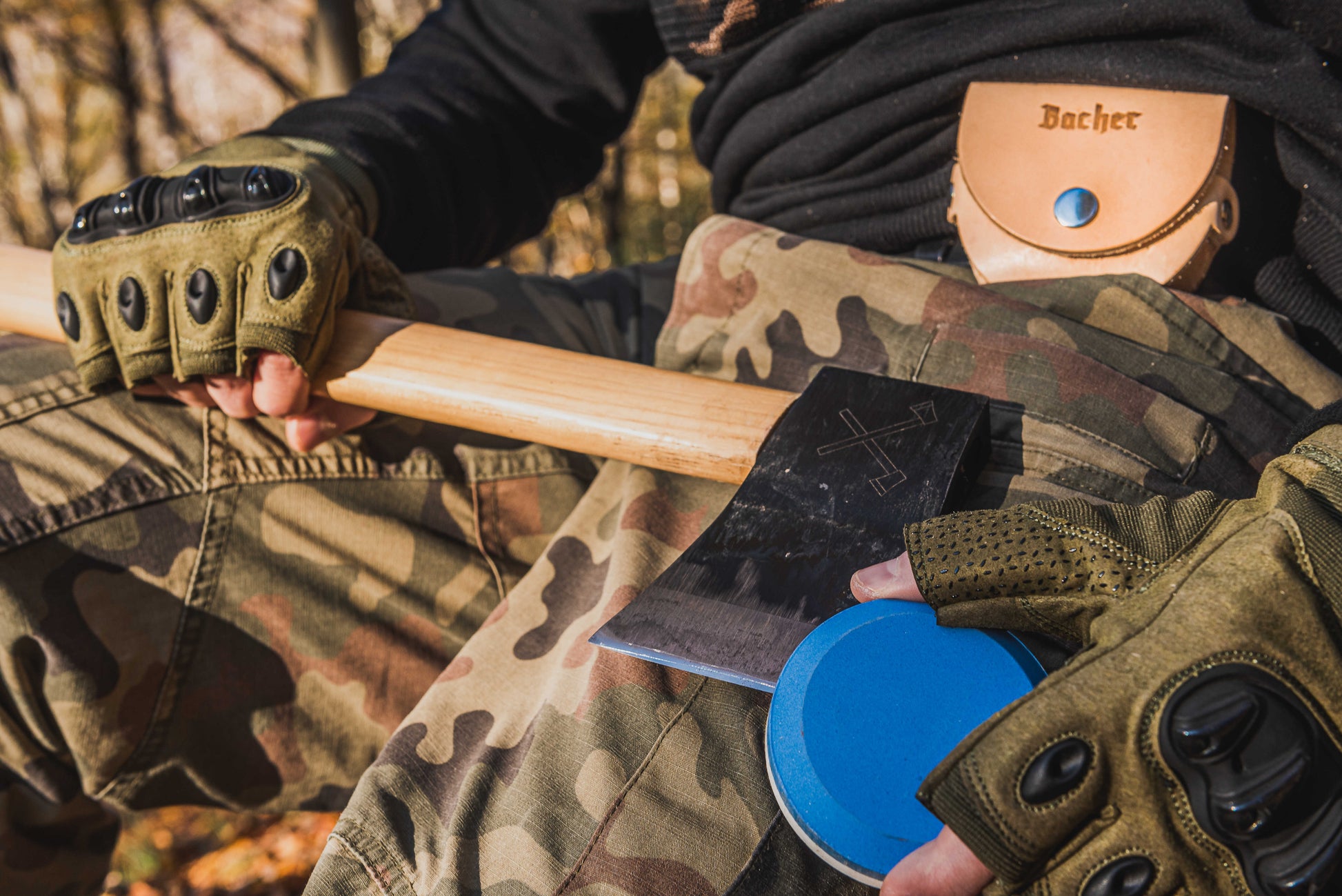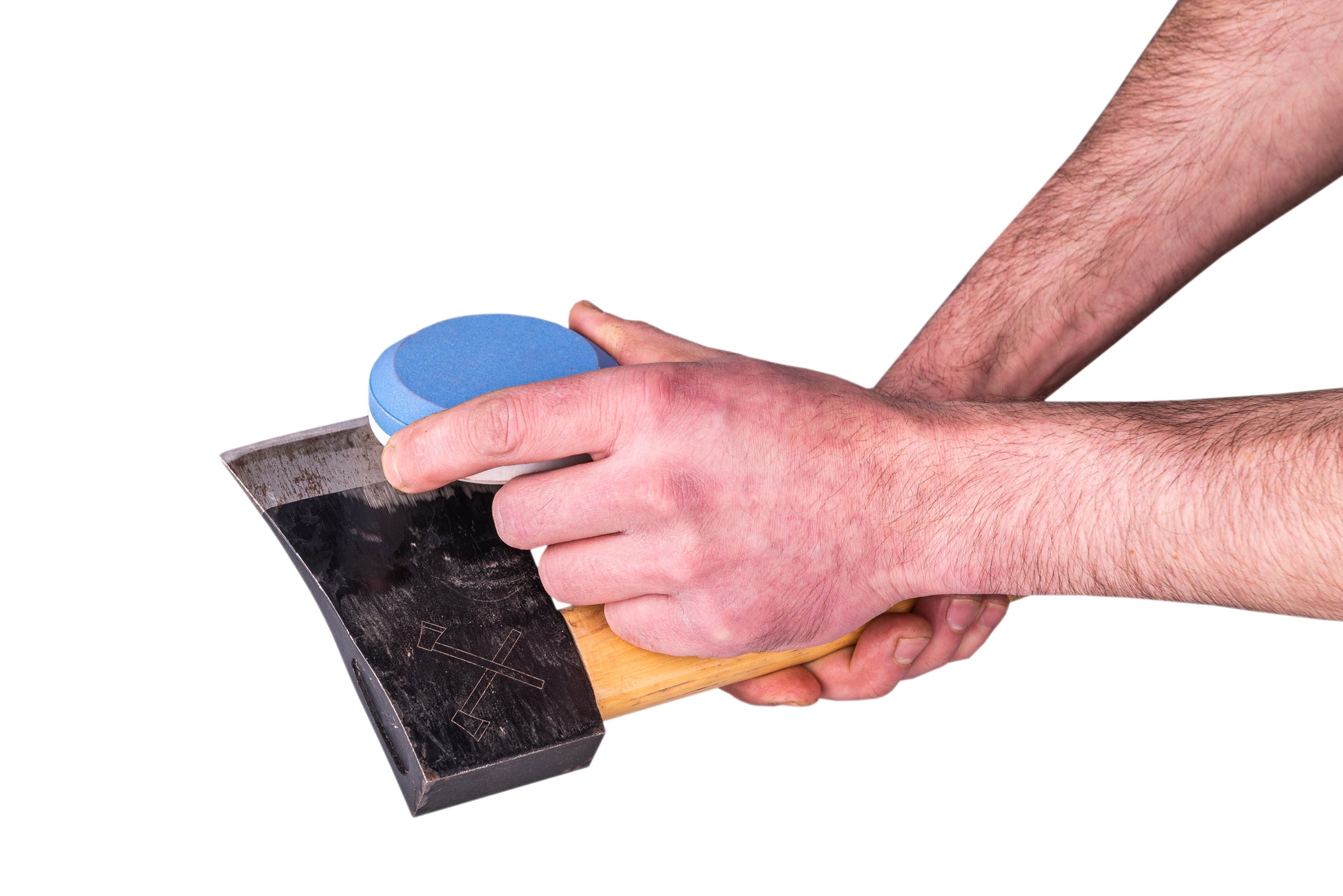 2. Hold the axe still, with the blade pointing upwards and move the stone in a circular motion along the edge. Use the lower grit side first, then finish sharpening with the higher grit side.