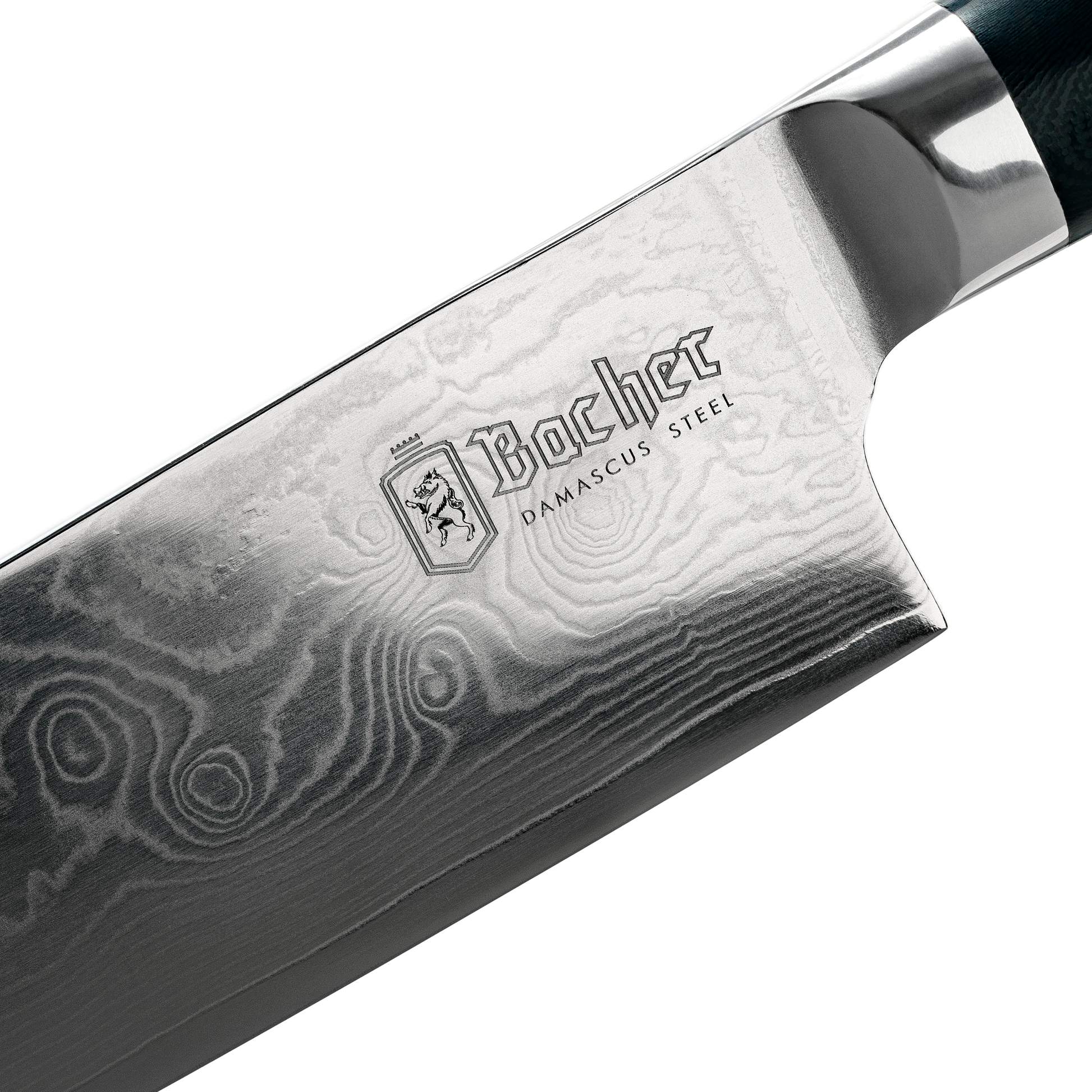 The extremely strong and hard blade of the Bacher chef's knife owes its spectacular sharpness the meticulously crafted blade, the process of multiple layering (alternating soft and harder layers) and the forging steel. The blade has 67 overlapping layers of high-carbon stainless steel. The core of the knife is made of Japanese, super-hard AUS-10V steel, and the alternating layers of 58 HRC and 60 HRC hardness, create a genuine Damascus steel blade with an original pattern that looks different on each knife, making it unique and one-of-a-kind.
