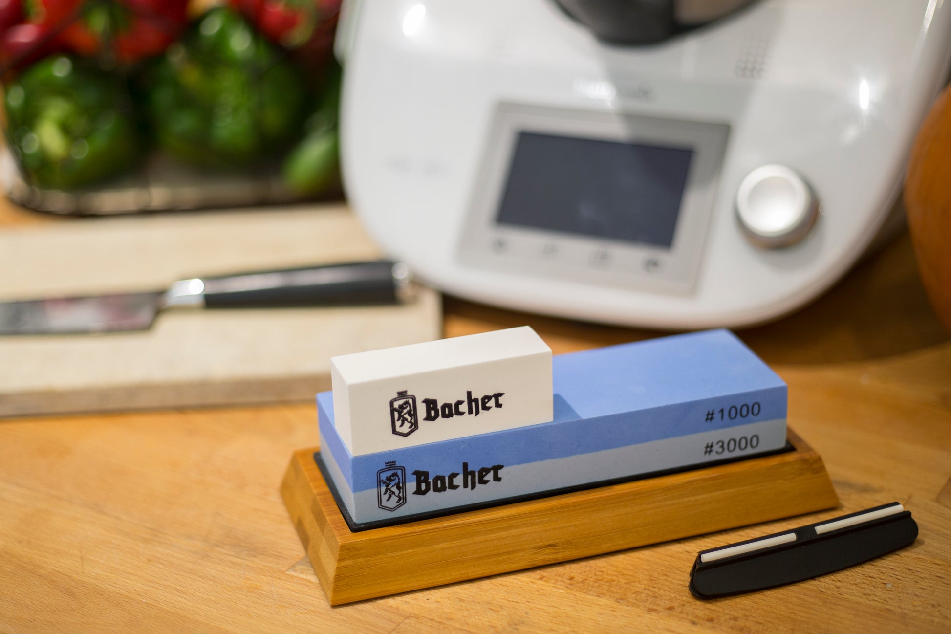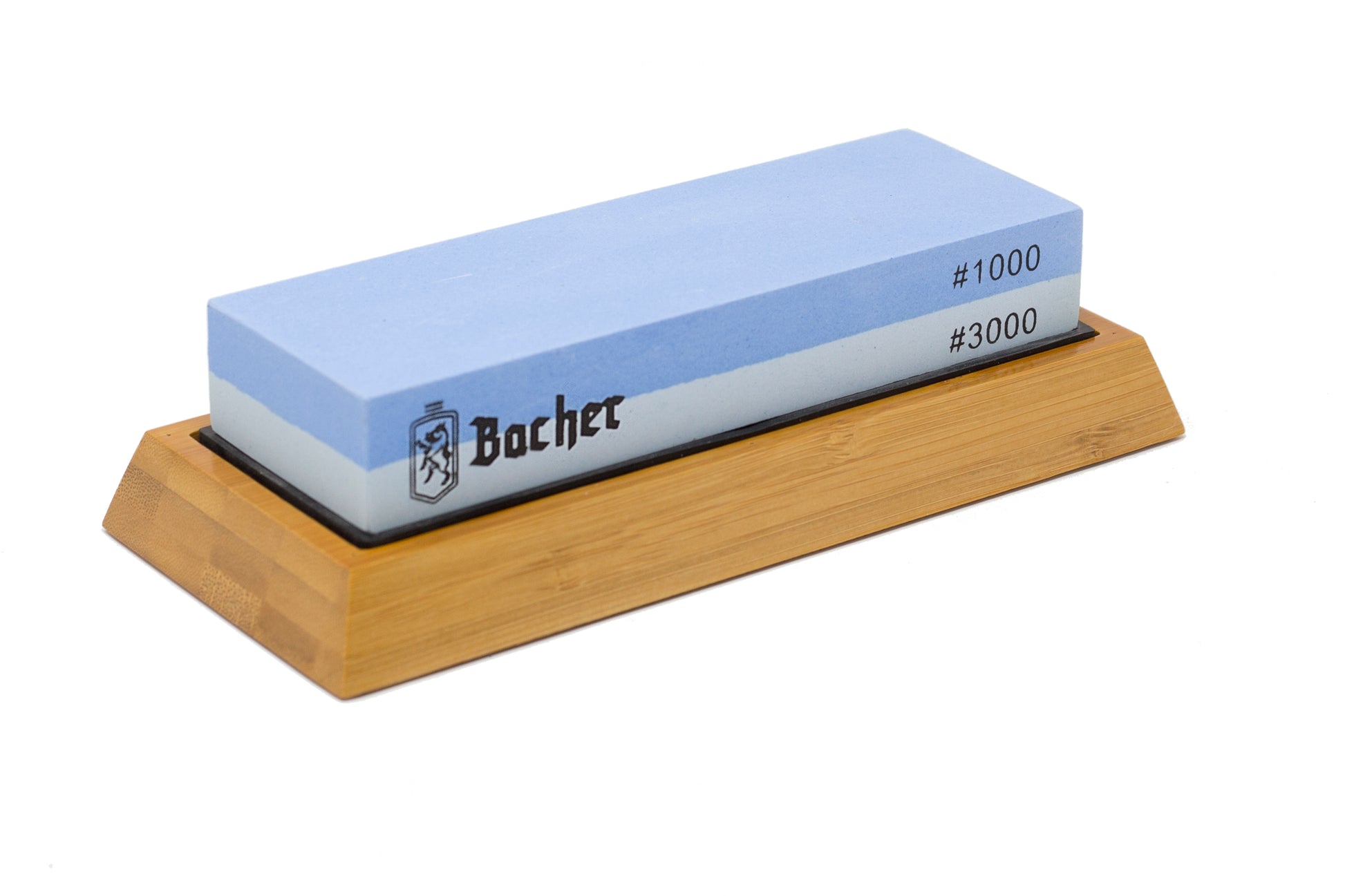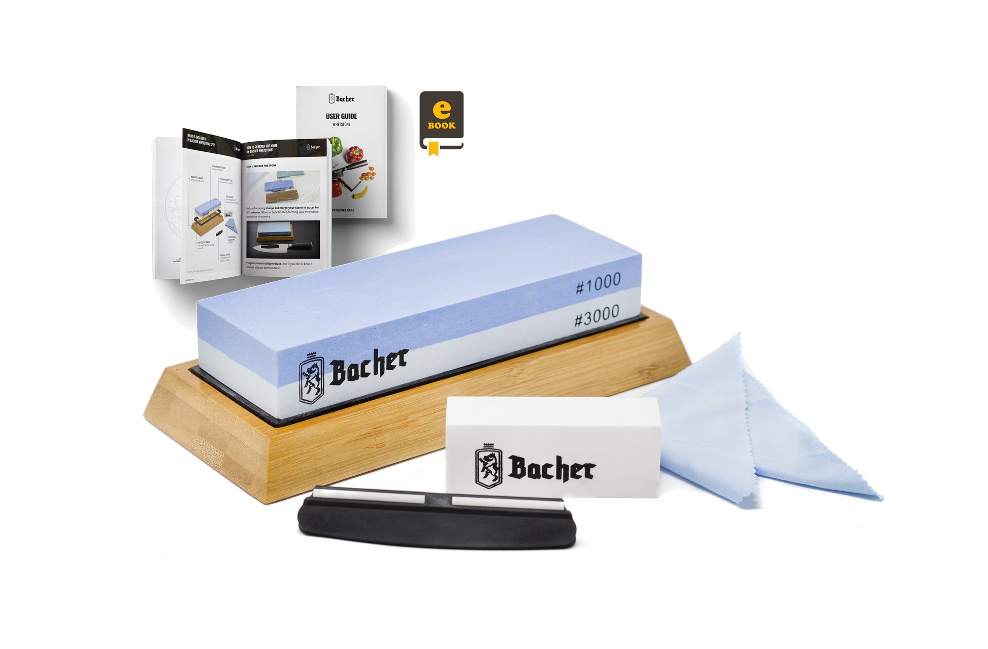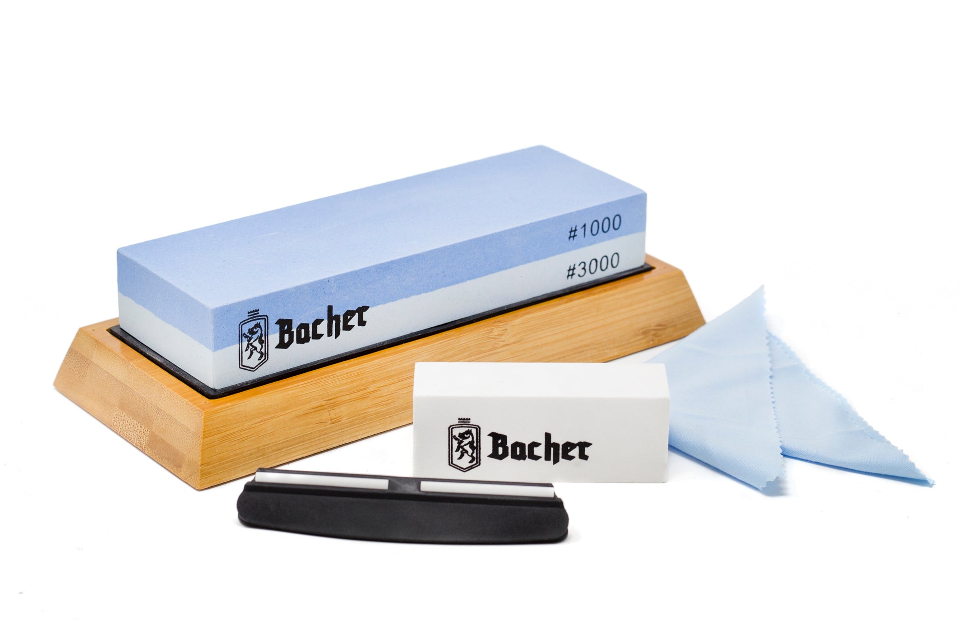 The Bacher double-sided stone sharpener is designed for sharpening all types of kitchen and outdoor knives, pocket knives, machetes and many others. The wide sharpening surface of the stone ensures proper adaptation to any blade size. The accessories supplied with the sharpener make sharpening easy, precise and safe.