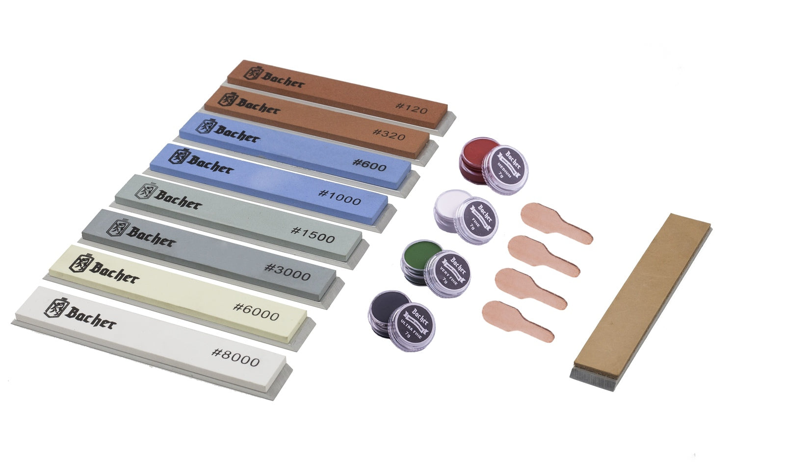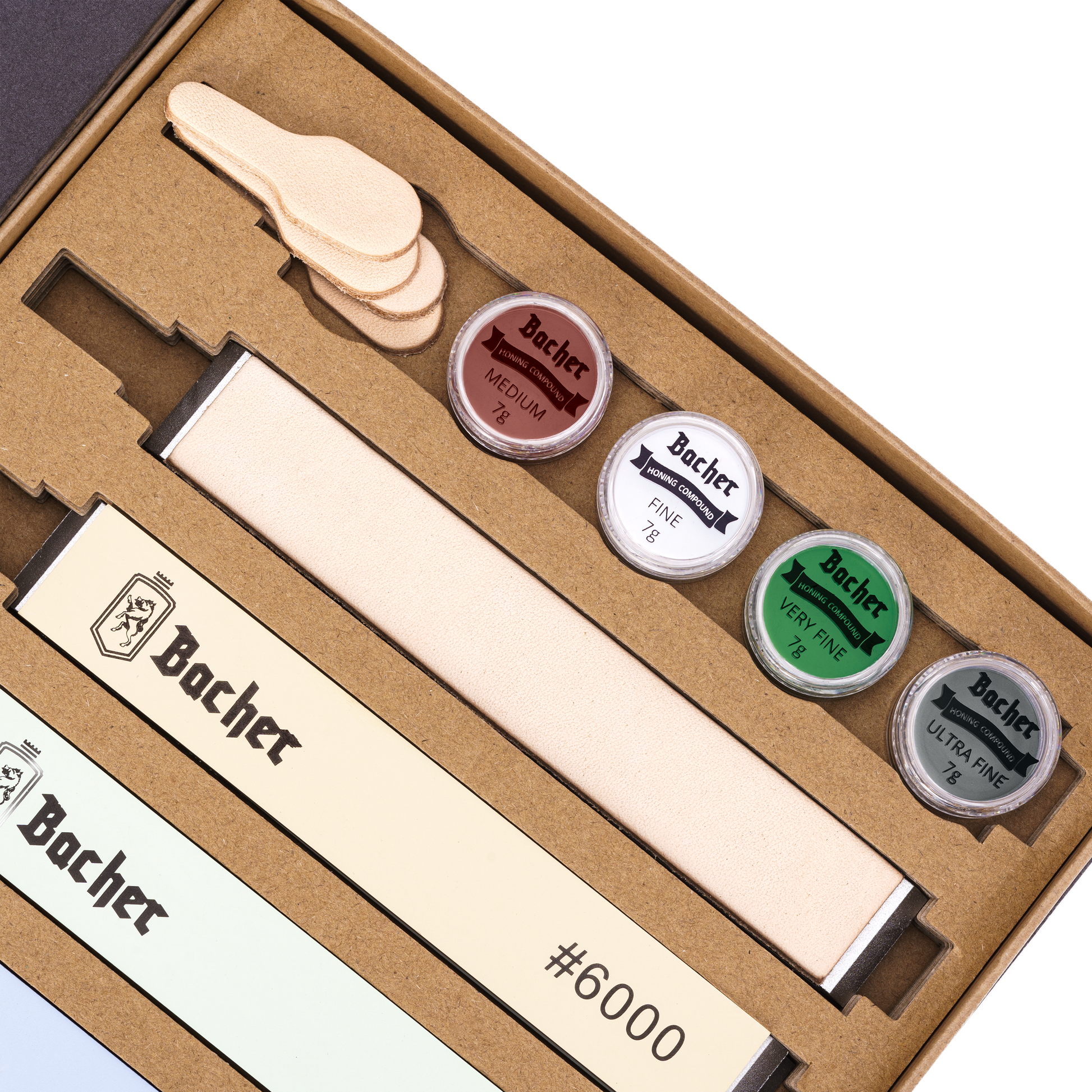 Set consisting of 8 pieces of replaceable whetstones for sharpening systems, leather strop for polishing the blade and four polishing pastes .