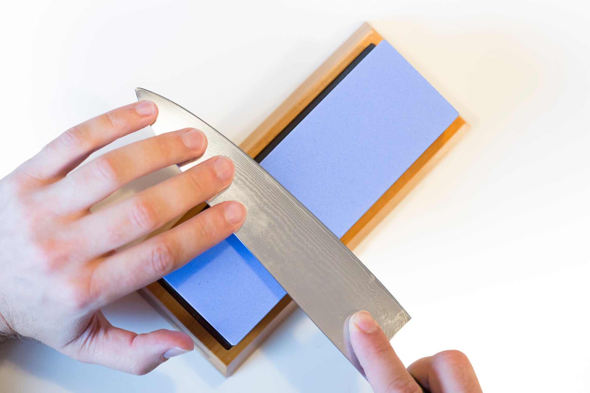 - Trzymając nóż pod odpowiednim kątem przesuwaj ostrze po kamieniu o niższej gradacji utrzymując stały, bardzo lekki nacisk przez około 10 min.
