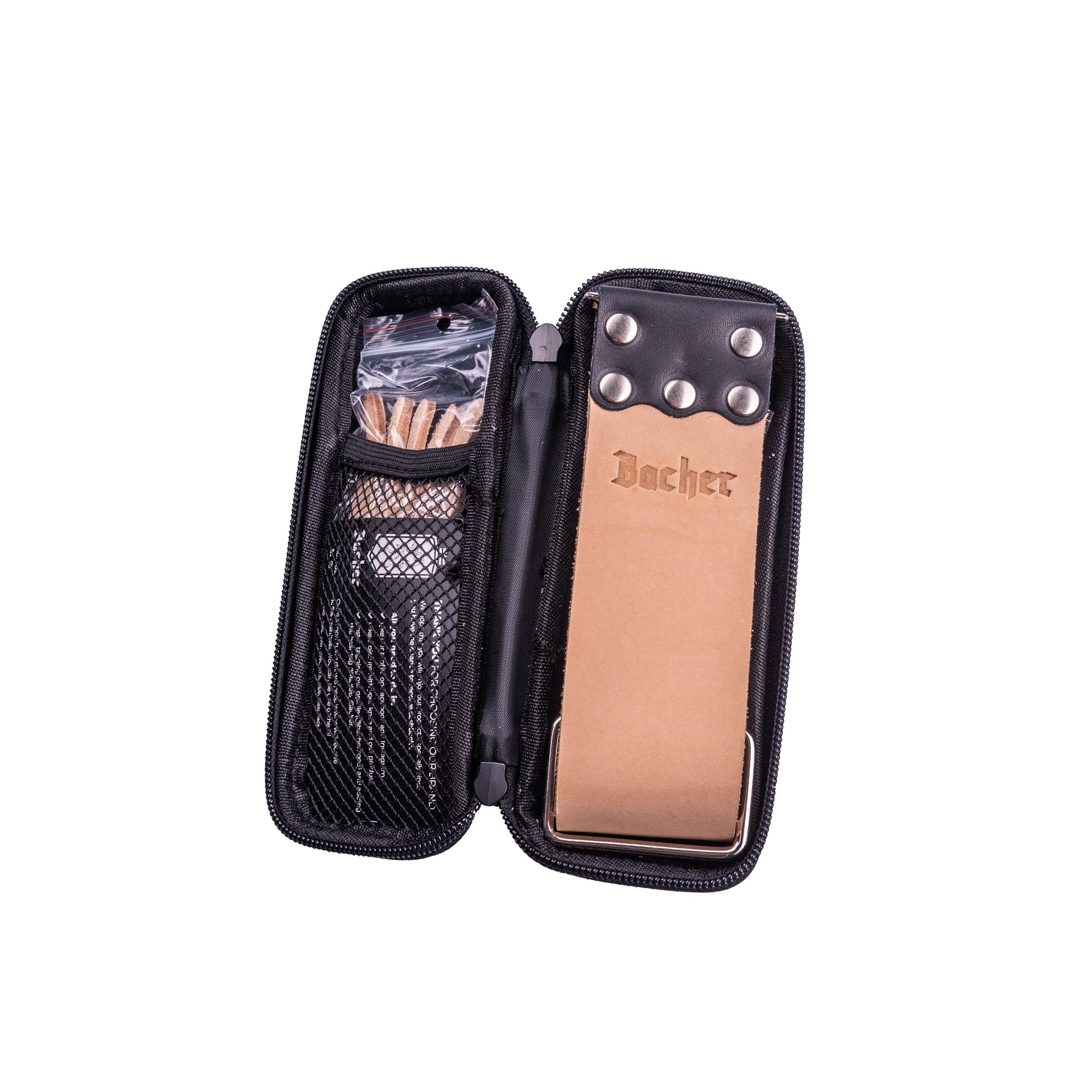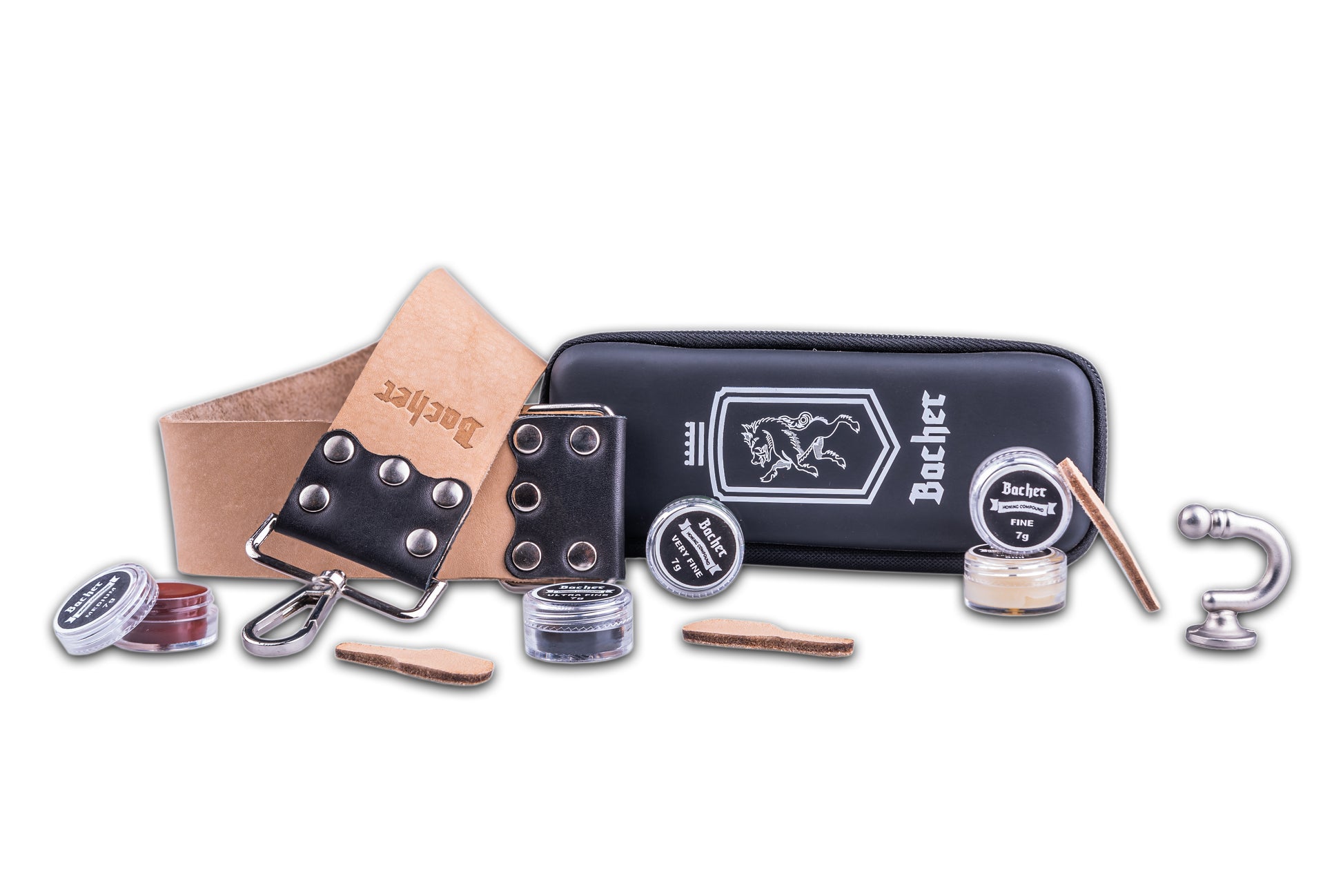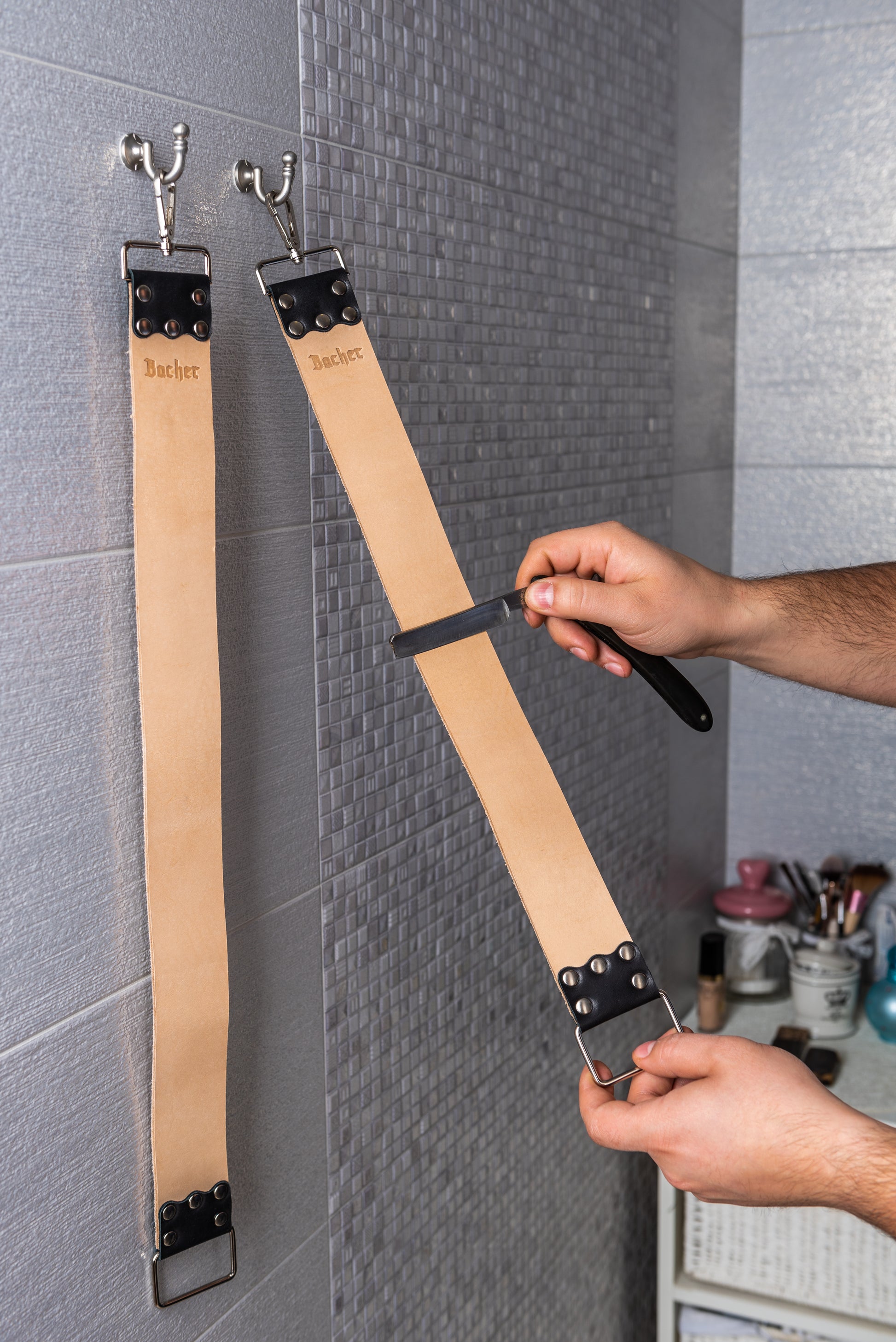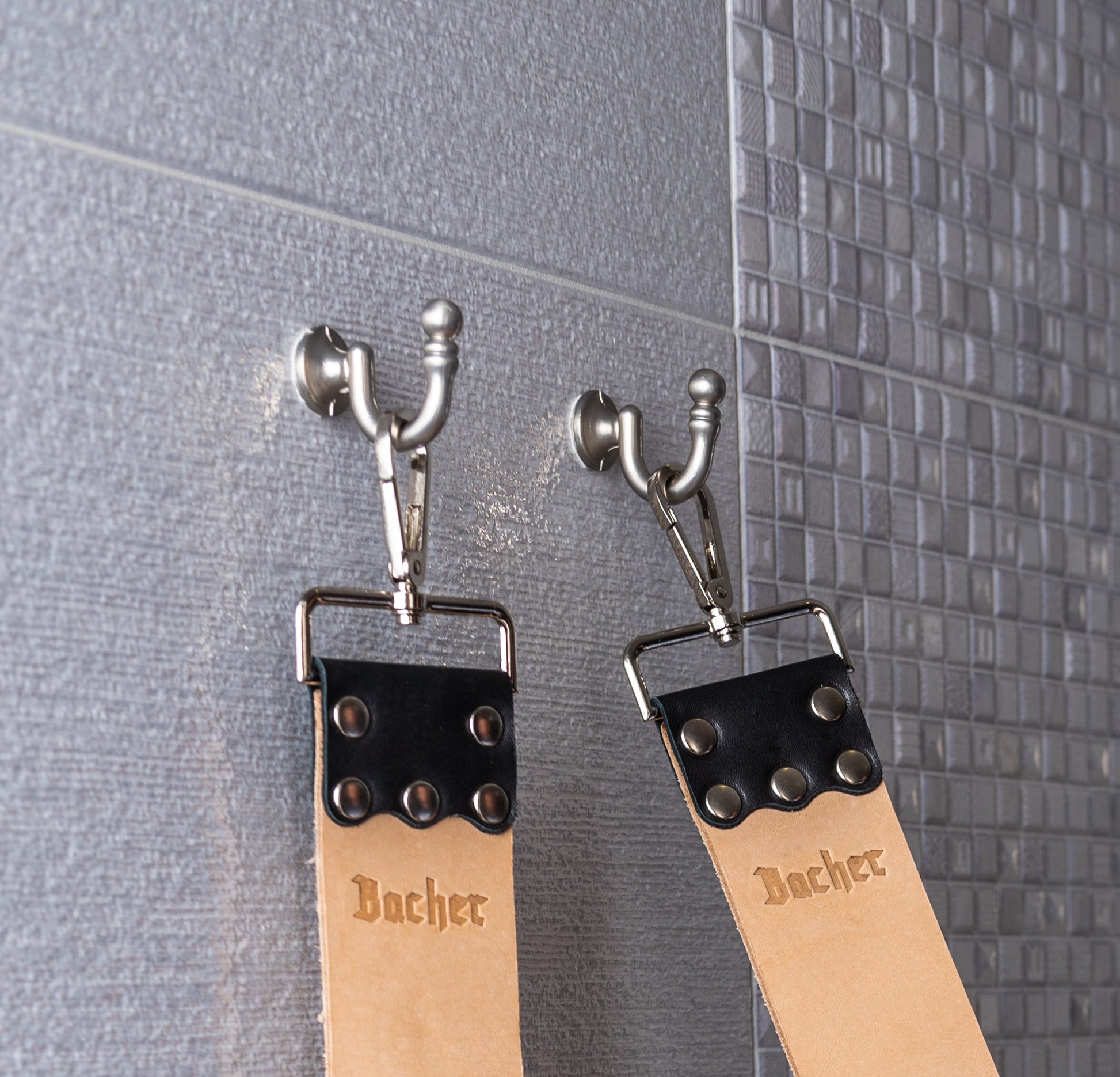 Pas wyposażony jest z jednej strony w wygodny uchwyt do trzymania, natomiast z drugiej strony w karabińczyk do zawieszania na haku. Karabińczyk umożliwia również zamocowanie pasa w dowolnym miejscu, również przypięcie go do szlufki spodni. Hak do zamocowania na ścianie jest dołączony do zestawu. Długość i szerokość pasa zapewniają komfortowe szlifowanie brzytwy, a niklowany karabińczyk oraz uchwyt umożliwiają wygodne mocowanie pasa oraz prawidłowe napięcie. Całość zapakowana jest w oryginalny, solidny pokrowiec z logo Bacher, umożliwiający bezpieczne przechowywanie i transport.