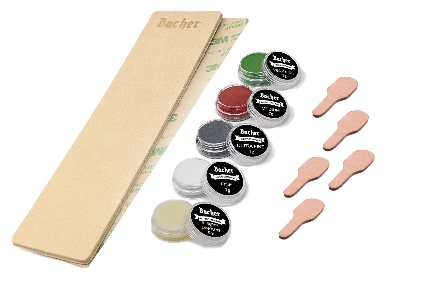 Zestaw do stropowania, wraz z kompletem czterech past polerskich i balsamem z woskiem pszczelim, tworzy praktyczny zestaw dedykowany do ostatniego etapu ostrzenia.